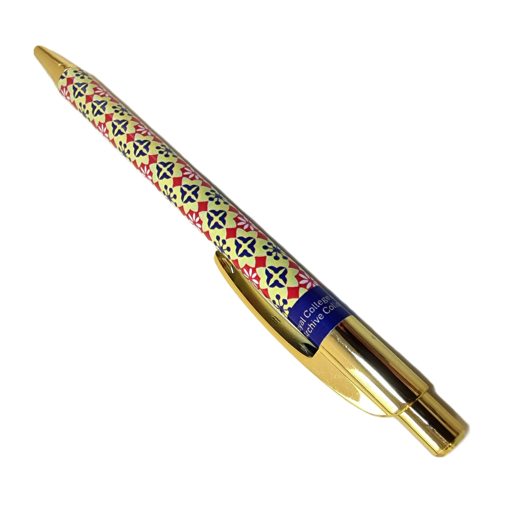 Retractable pen with a gold-coloured body and decorated with a floral pattern with RCN colour (Blue & Red).